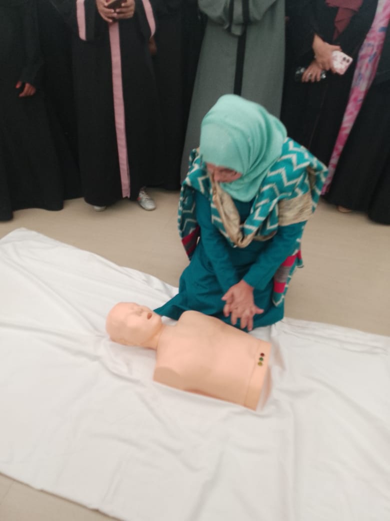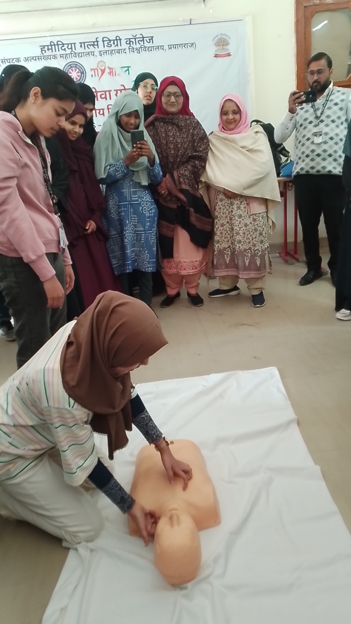 The fourth day of the seven-day special camp organized by the National Service Scheme (NSS) unit of Hamidia Girls Degree College, a constituent minority college of Allahabad University, was successfully conducted with a comprehensive training session on Life-Saving Skills& First Aid. The day’s activities were organized in accordance with the main theme of the camp, “Youth Empowerment, Digital Development and Sustainability.”