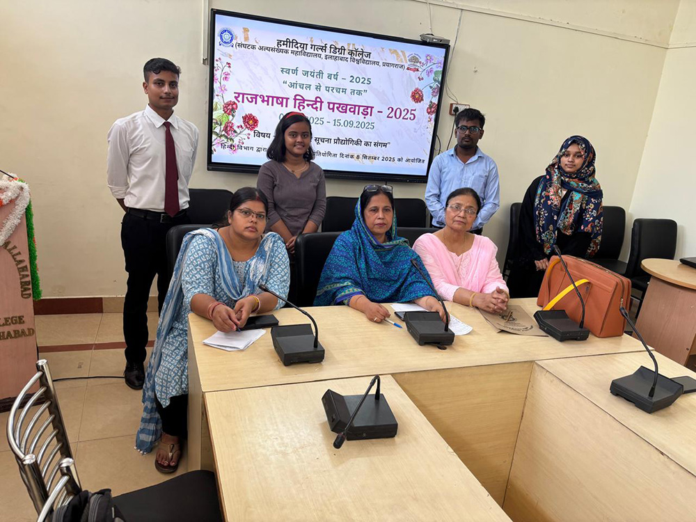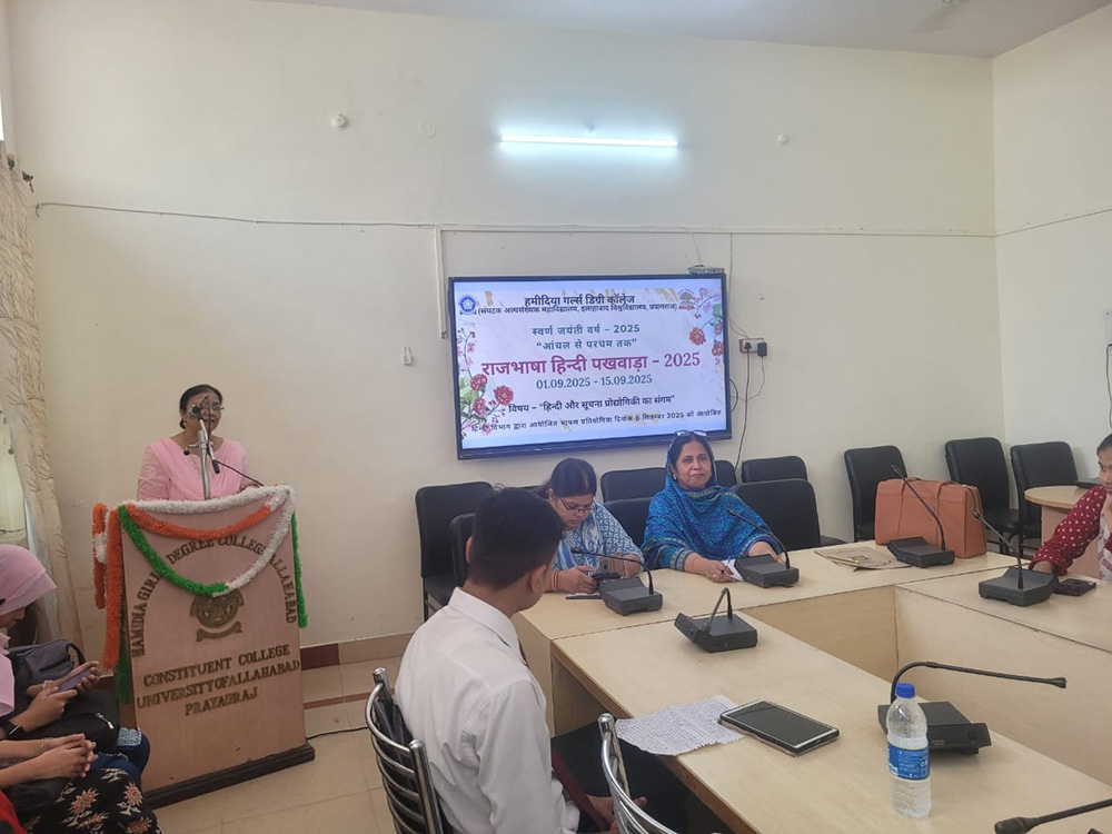 हमीदिया गर्ल्स डिग्री कॉलेज, प्रयागराज के हिन्दी विभाग द्वारा प्रतिवर्ष की भाँति इस वर्ष भी 1 सितम्बर 2025 से 15 सितम्बर 2025 तक “हिन्दी दिवस एवं राजभाषा पखवाड़ा” का सफल आयोजन किया गया। इस अवसर पर विविध प्रतियोगिताओं का आयोजन किया गया, जिनमें छात्राओं तथा छात्रों ने अत्यंत उत्साह और सक्रियता के साथ भाग लिया।